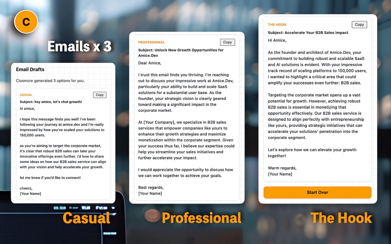 - Want to try Closmore? I am opening a limited number of slots for early trial users. If you want to stop research fatigue and start sending better sales emails, contact me.