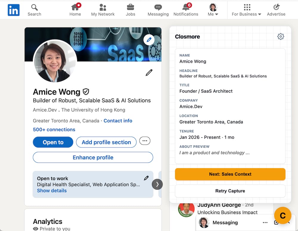 I published a full walkthrough with screenshots and the complete UI here: Closmore 1.0 — AI Sales Copilot for LinkedIn